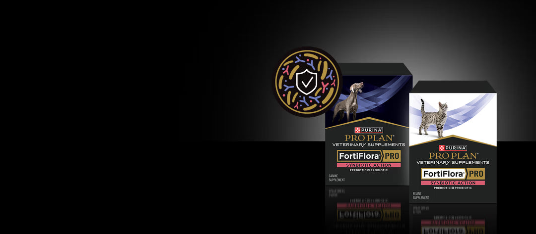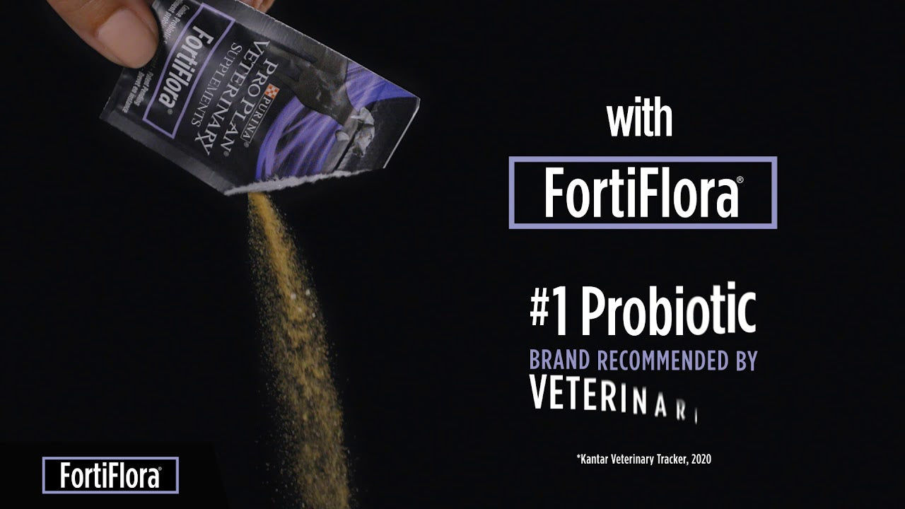 Made with the same probiotic strain in FortiFlora, and contains prebiotic fiber (psyllium) to stimulate the growth of specific bacteria including Lactobacillus and Bifidobacterium species. Only available through your veterinarian or Pro Plan® Vet Direct.